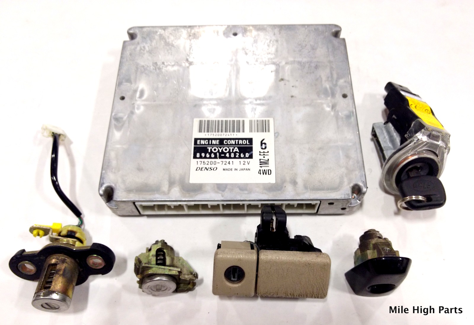 ECU with key. Complete re-key set. Includes ignition+ key, door locks, glovebox lock, trunk lock.